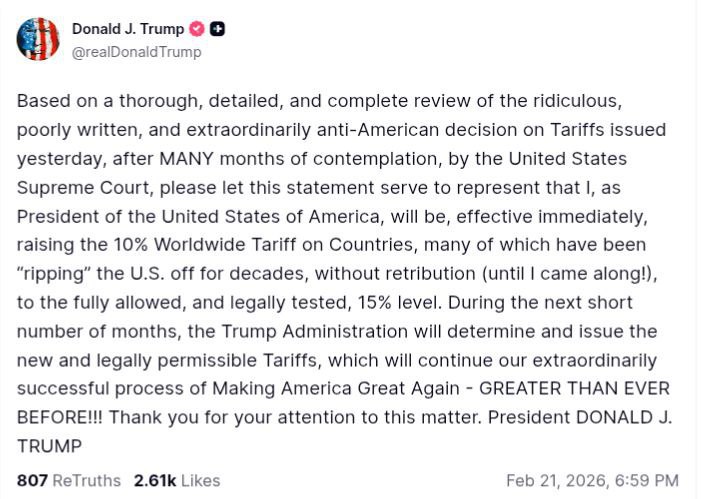 «После тщательного, детального и полного рассмотрения нелепого, плохо написанного и чрезвычайно антиамериканского решения по тарифам, вынесенного вчера Верховным судом Соединённых Штатов после многих месяцев раздумий, настоящим заявляю, что я, как президент Соединённых Штатов Америки, немедленно повышаю мировой тариф в размере 10% для стран, многие из которых десятилетиями “обдирали” США без всяких последствий [пока не появился я], до полностью допустимого и юридически проверенного уровня в 15%.