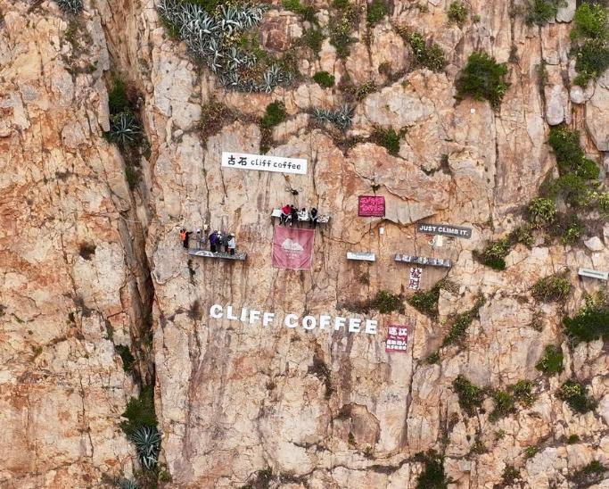 «Кофейня, расположенная на отвесной скале в провинции Фуцзянь, позиционирует себя как «самая экстремальная в мире». Посетителям предлагают кофе на узкой доске с видом на море. За 398 юаней [4,4 тысячи рублей] заведение предоставляет кофе, страховку, оборудование и услуги инструктора, который выполняет функции гида, официанта и фотографа»