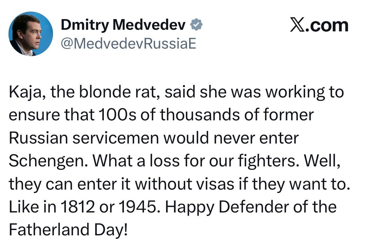 Крыса-блондинка Кая сказала, что работает над тем, чтобы сотни тысяч бывших российских военнослужащих никогда не въехали в Шенгенскую зону. Какая потеря для наших бойцов! Ну, они могут въехать туда без виз, если захотят. Как в 1812 или 1945 году.