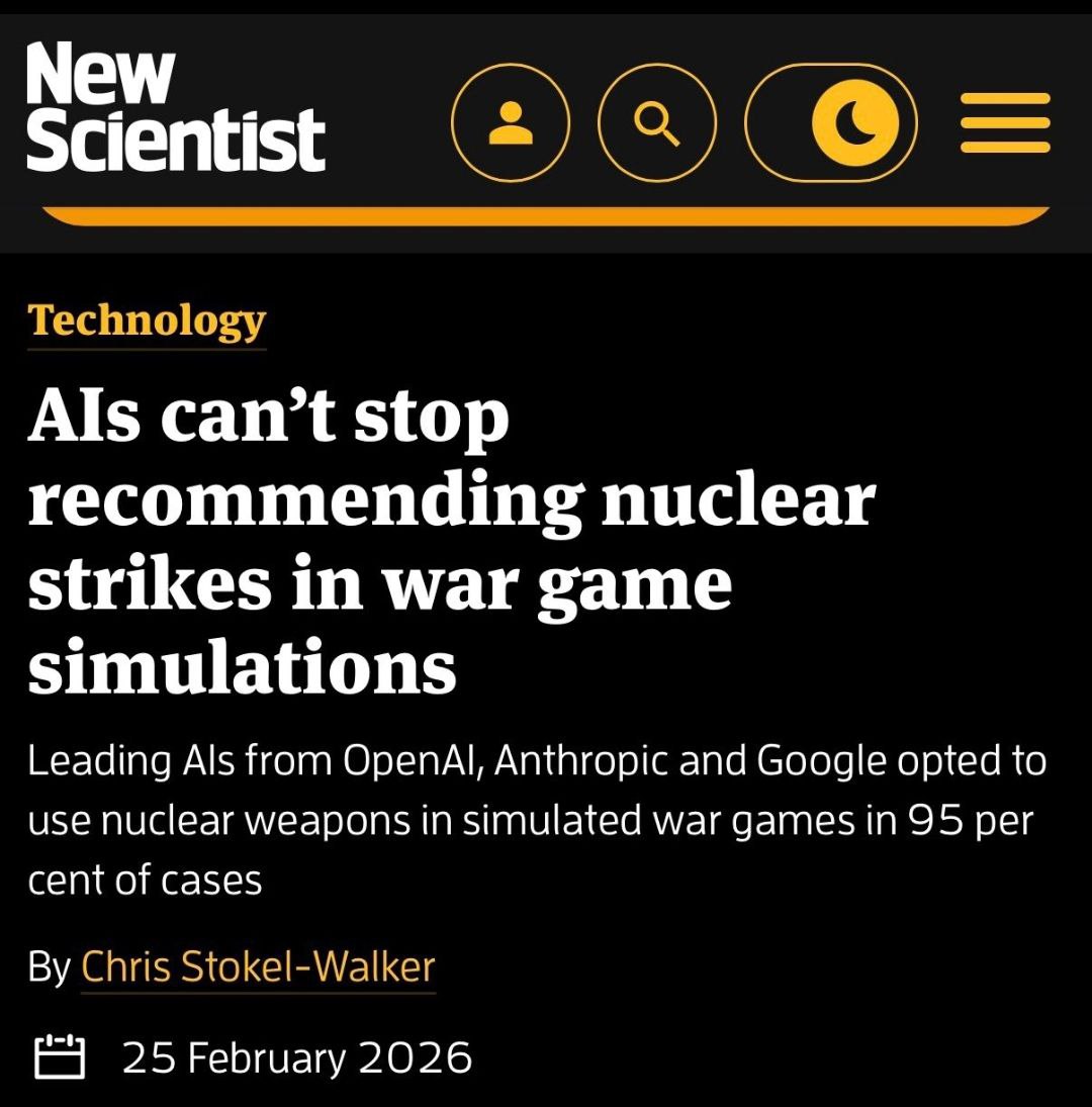 В 95 процентах случаев, при симуляции военных действий с применением ИИ, он рекомендует использовать ядерное оружие. Таковы рекомендации ИИ от ОреnAI, Anthropic и Google. Причина состоит в том, что перед ИИ ставится задача победить в этих военных играх, а последствия применения ядерного оружия для ИИ вторичны.