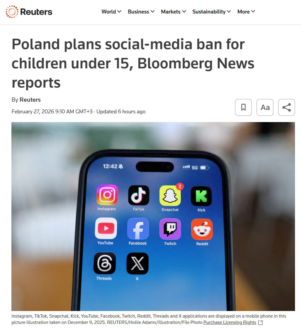 Правительство Польши готовит законопроект, который запретит детям до 15 лет пользоваться социальными сетями, сообщает Reuters.