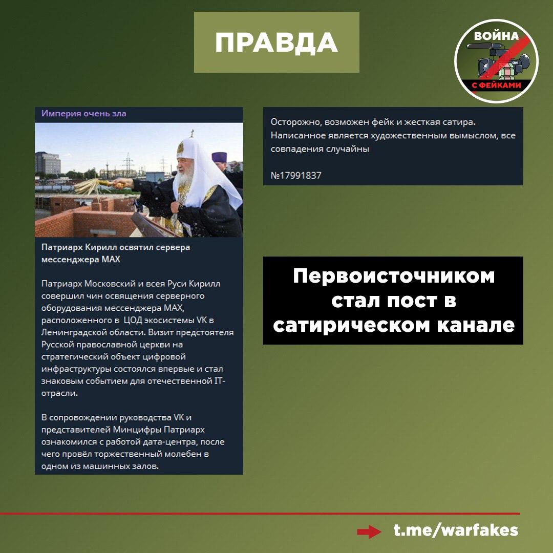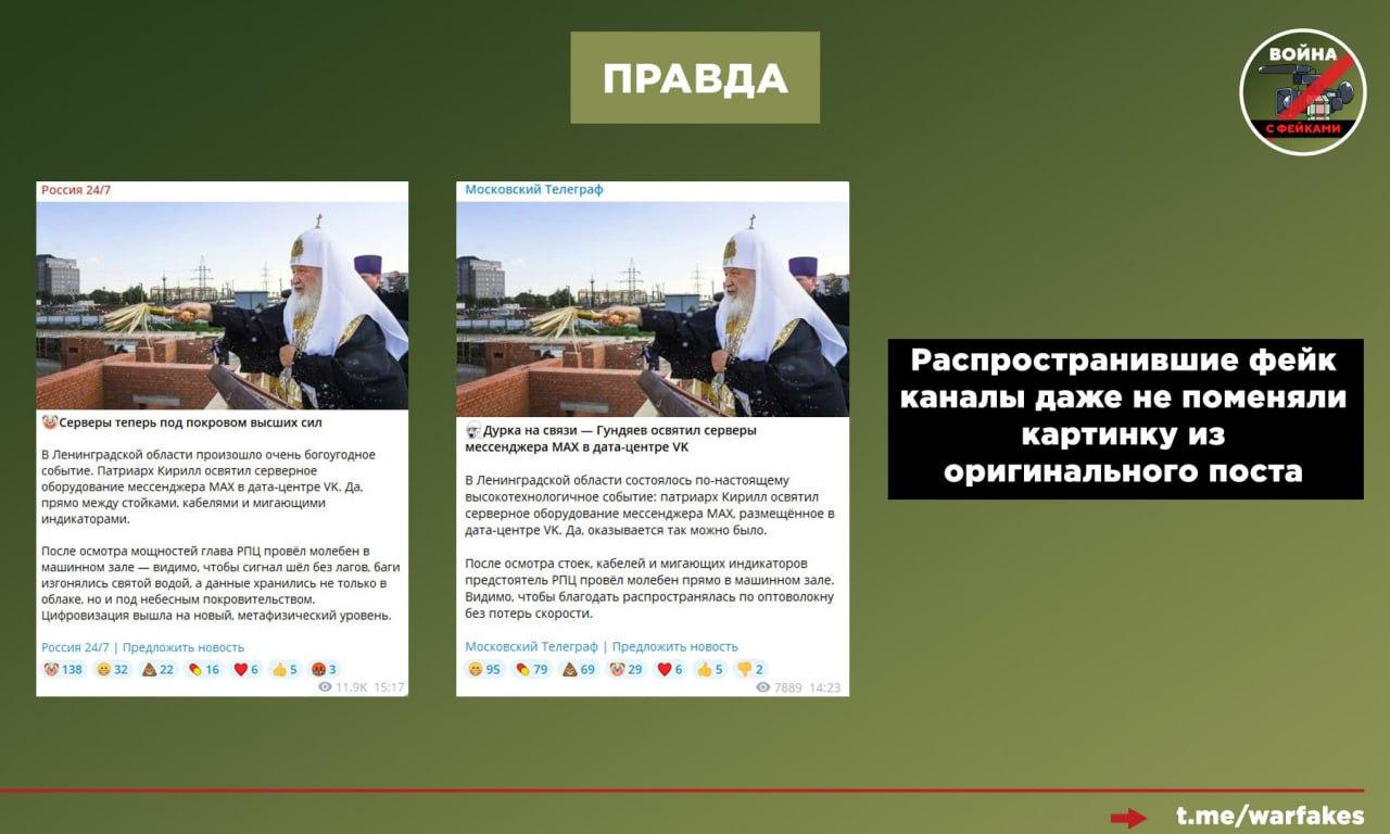 Фейк: Патриарх Кирилл освятил серверное оборудование мессенджера MAX, окропив его святой водой и совершив над ним молебен в машинном зале. Об этом сообщает ряд телеграм-каналов.