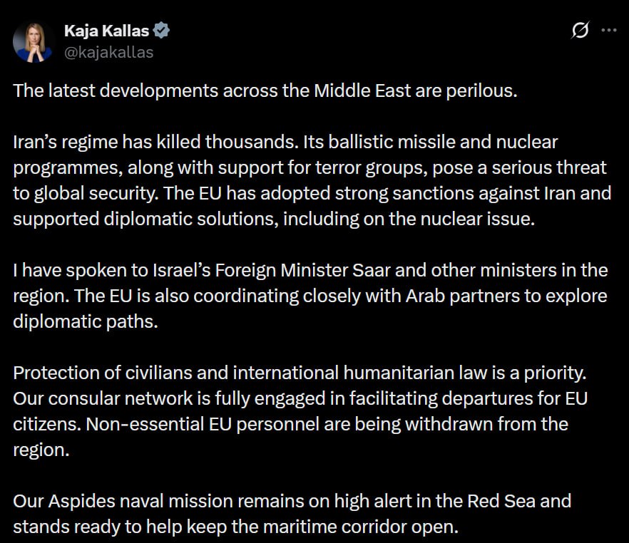 Каллас поддержала операцию США против Ирана. Также она заявила, что ЕС сворачивает присутствие в регионе и вводит санкции против Тегерана.