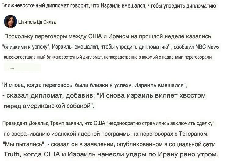 Израиль помешал переговорам между США и Ираном, сообщает NBC News со ссылкой на неназванного дипломата одной из стран Ближнего Востока.