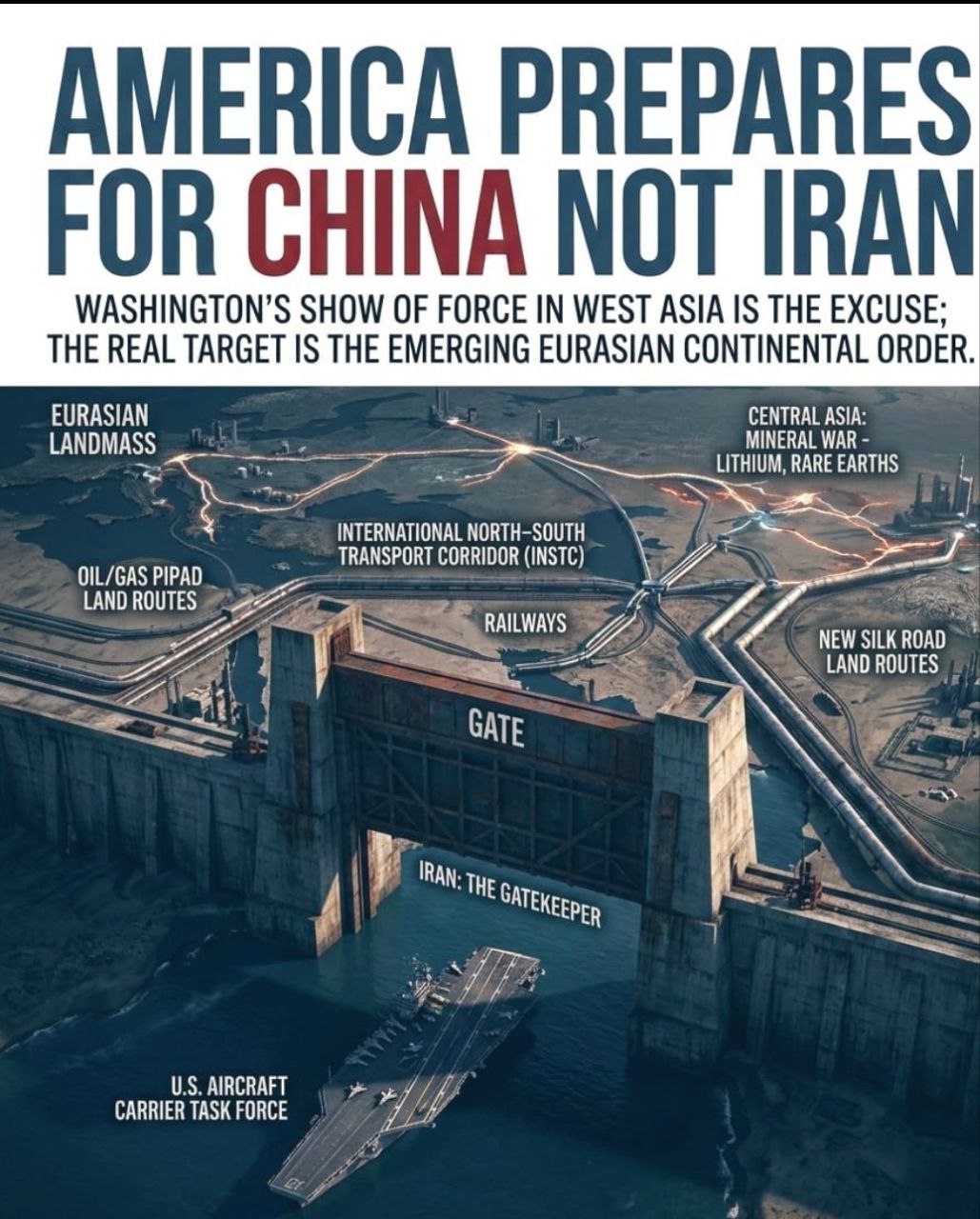 Многие усматривают в войне против Ирана демонстрацию силы, направленную далеко не только против Ирана, а против Китая и возникающего евразийского континентального порядка. США не устраивает геополитическая потеря Евразии -и они наносят удар под одной из опор этого порядка.