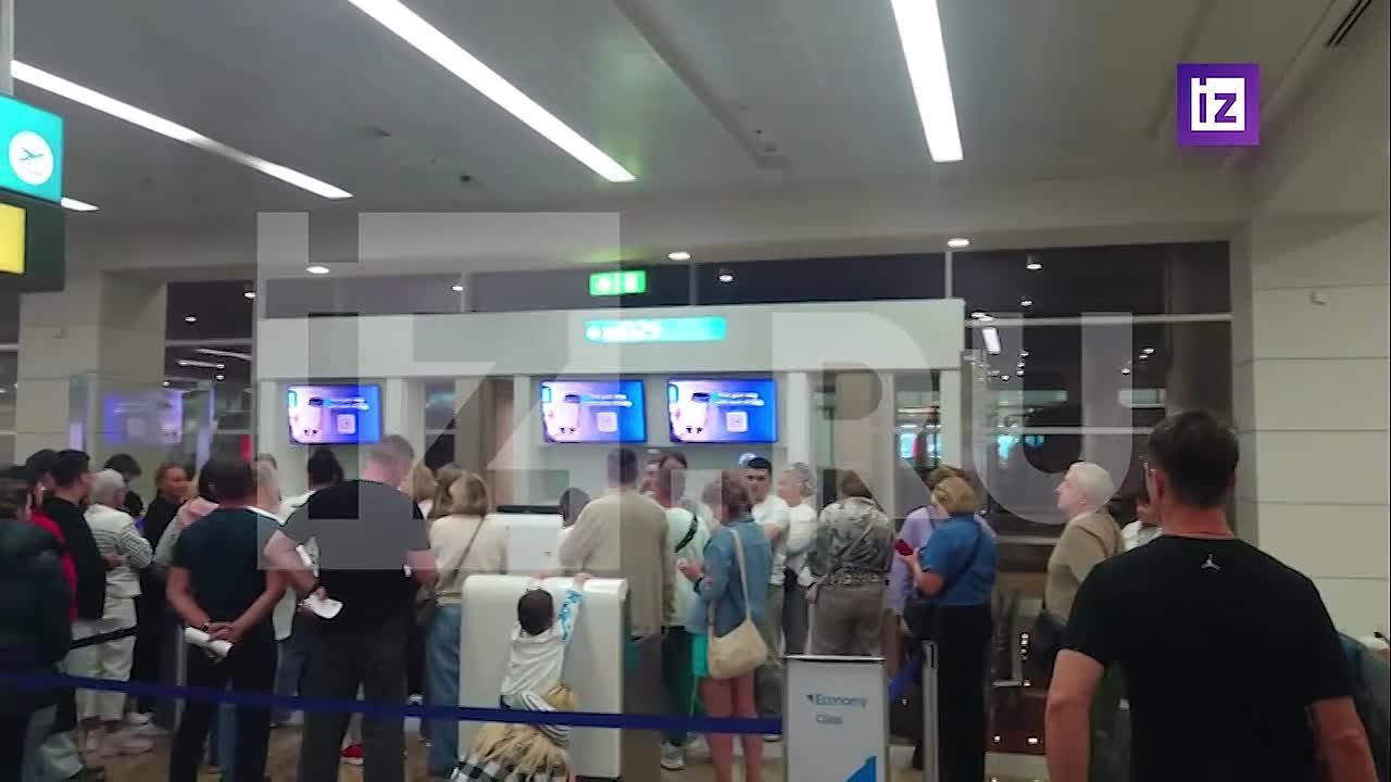 На кадрах "Известий" — очереди у стоек регистрации в аэропорту Дубая.