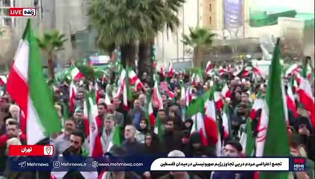 Кадры публикуют иранские СМИ. На них — множество людей с национальными флагами скандируют лозунги на площади.