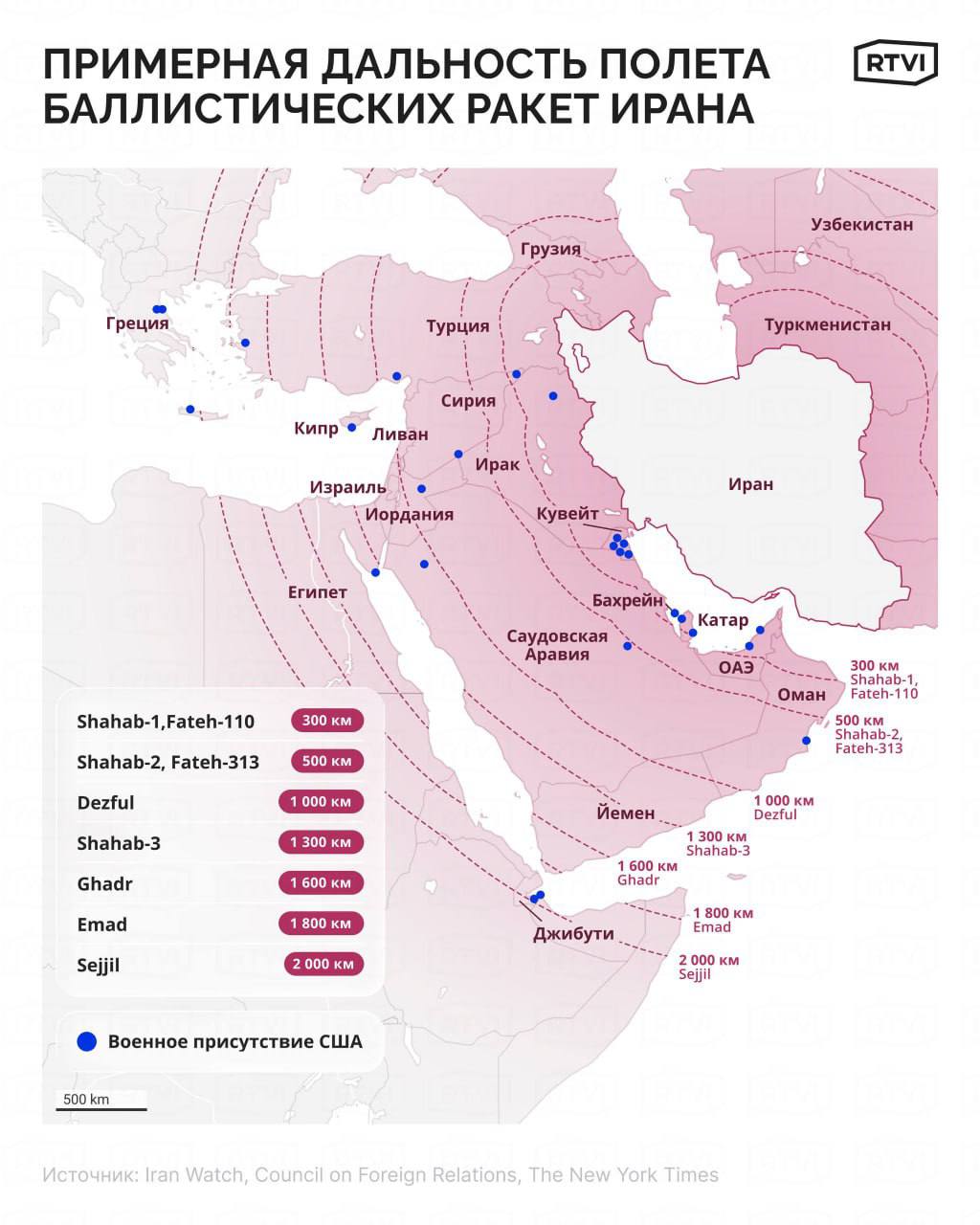 RTVI показывает дальность ракет, которые имеются в арсенале Ирана и возможные цели