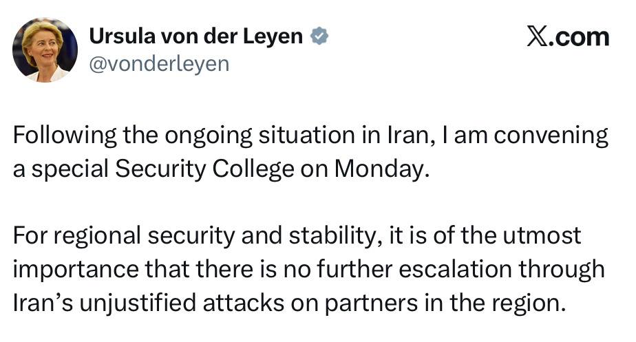 В связи с текущей ситуацией в Иране я созываю в понедельник специальное заседание Европейского колледжа безопасности и обороны. Для региональной безопасности и стабильности крайне важно предотвратить дальнейшую эскалацию конфликта посредством неоправданных нападений Ирана на партнеров в регионе.