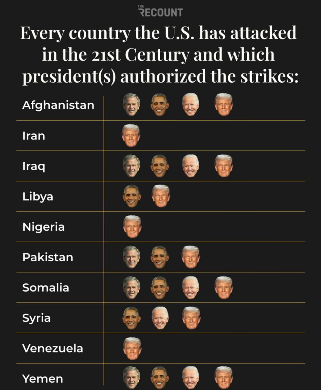 В сети разошлась инфографика со списком стран, которые США бомбили в XXI веке, и с указанием президентов, при которых это происходило. Афганистан, Ирак, Ливия, Сирия, Йемен, Сомали, Пакистан, Иран и другие.