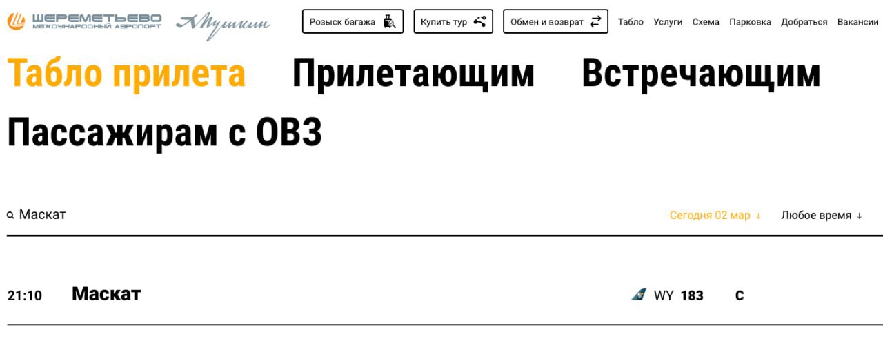 Аэропорт Шереметьево ожидает сегодня рейс Oman Air из Маската. Судя по данным табло аэропорта, прилет лайнера из столицы Омана ожидается в 21:10