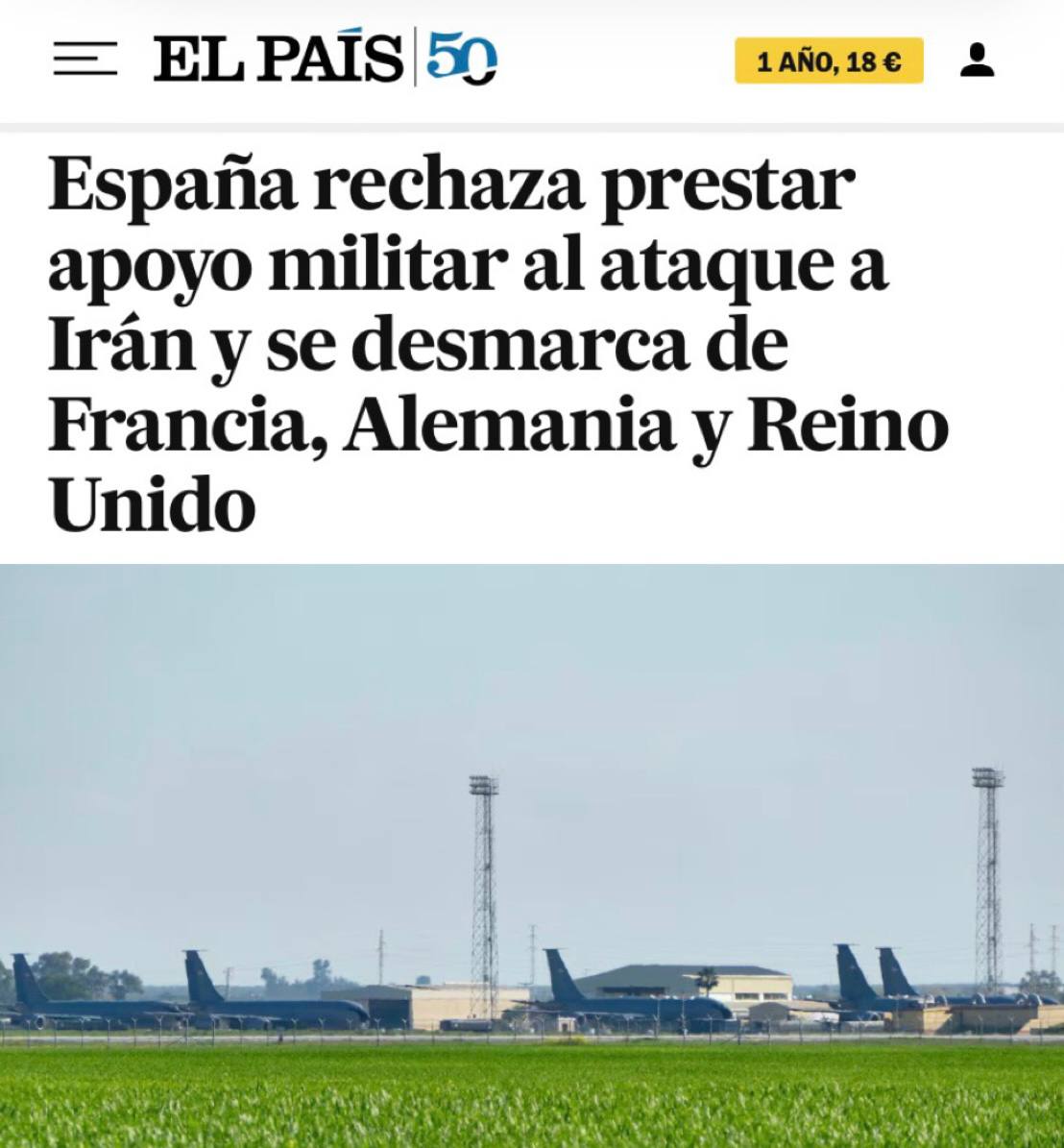 «Испания отказалась поддерживать военную операцию США и Израиля против Ирана. Министр иностранных дел Хосе Мануэль Альбарес заявил, что Европа должна выступать голосом умеренности, деэскалации и возвращения к переговорам. Он осудил односторонние военные действия вне рамок ООН и подчеркнул приоритет международного права. Испания запретила Трампу использовать свои военные базы для нападений на Иран и поэтому выслала танкеры ВВС США, дислоцирующиеся там.