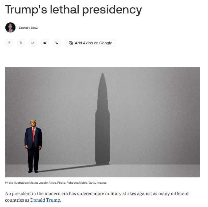 «Ни один президент в современной истории не отдавал приказов о большем количестве военных ударов по такому количеству разных стран, как Дональд Трамп. Он атаковал семь государств, три из которых — Иран, Нигерия и Венесуэла — никогда ранее не были целями американских военных ударов», — сообщает Axios.