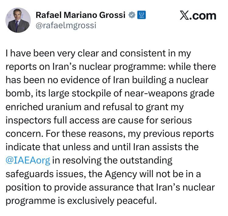 В своих докладах о ядерной программе Ирана я всегда предельно ясно и последовательно заявлял, что хотя нет никаких доказательств того, что Иран создает ядерную бомбу, его большие запасы обогащенного урана, близкого к оружейному качеству, и отказ предоставить моим инспекторам полный доступ вызывают серьезную озабоченность.