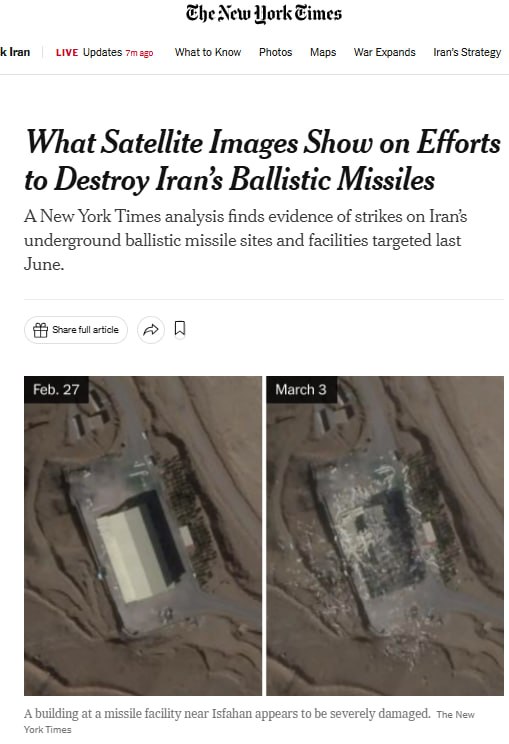 Под удар попали подземные базы, где Иран хранит и производит свои баллистические ракеты, приводя спутниковые снимки сообщает The New York Times. Насколько серьёзно — пока не установлено.