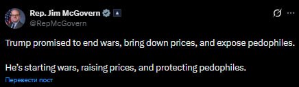 «Трамп обещал положить конец войнам, снизить цены и разоблачить педофилов. Он развязывает войны, завышает цены и покрывает педофилов», заявил демократ Джеймс Макговерн.