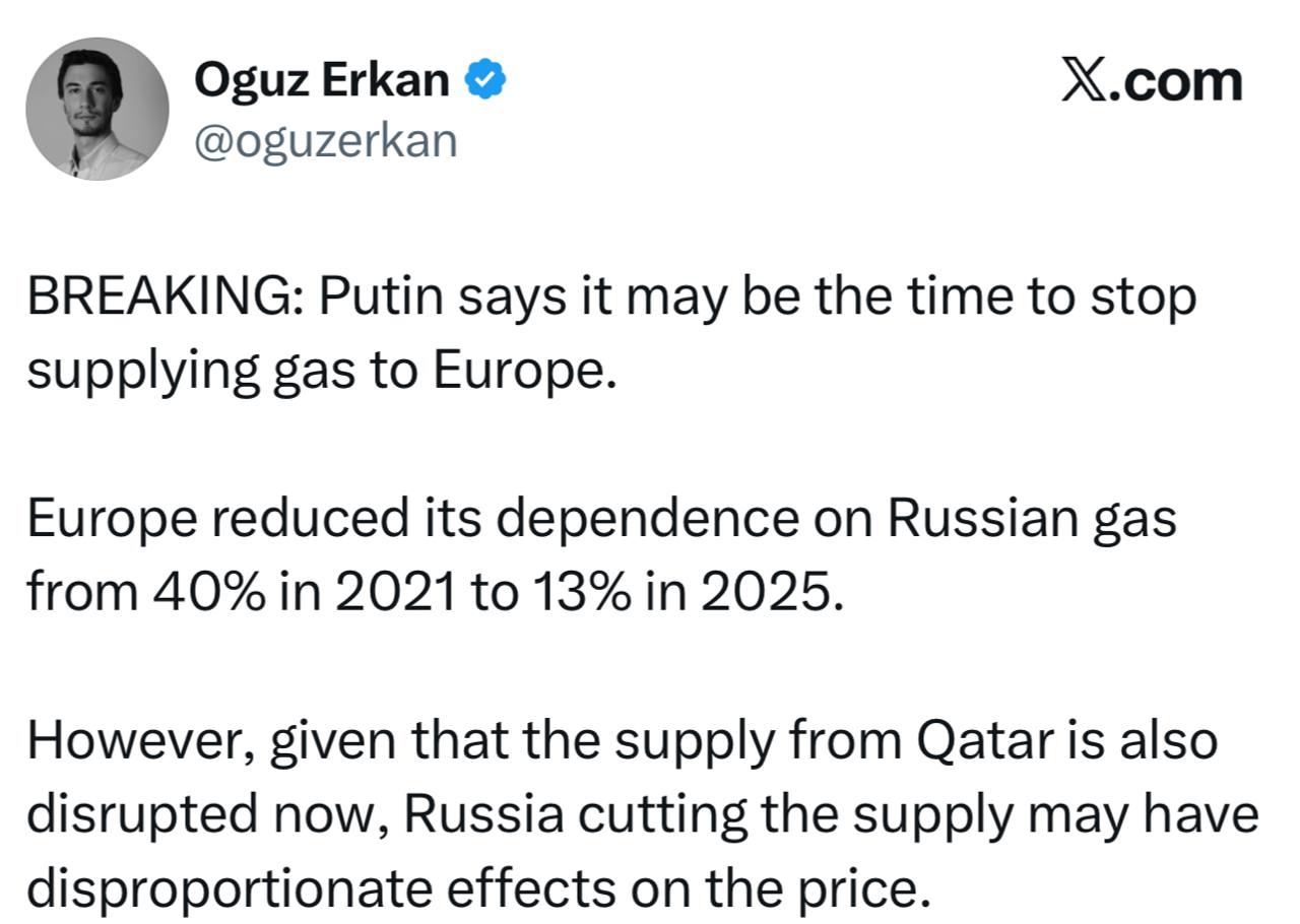 Путин говорит, что, возможно, настало время прекратить поставки газа в Европу. Европа сократила свою зависимость от российского газа с 40% в 2021 году до 13% в 2025 году. Однако, учитывая, что поставки из Катара также нарушены, сокращение Россией поставок может оказать непропорциональное влияние на цену.