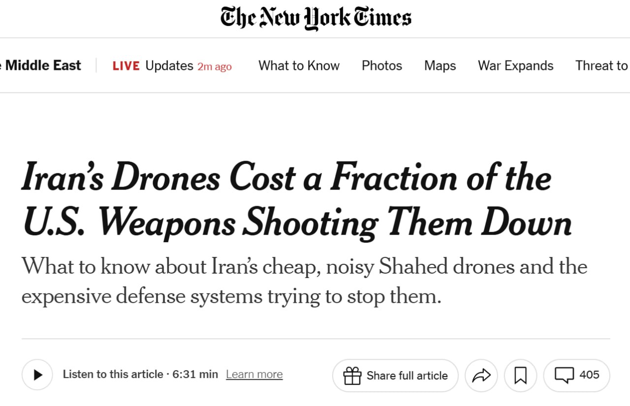 The New York Times: Иран истощает запасы ракет США и союзников дешевыми дронами
