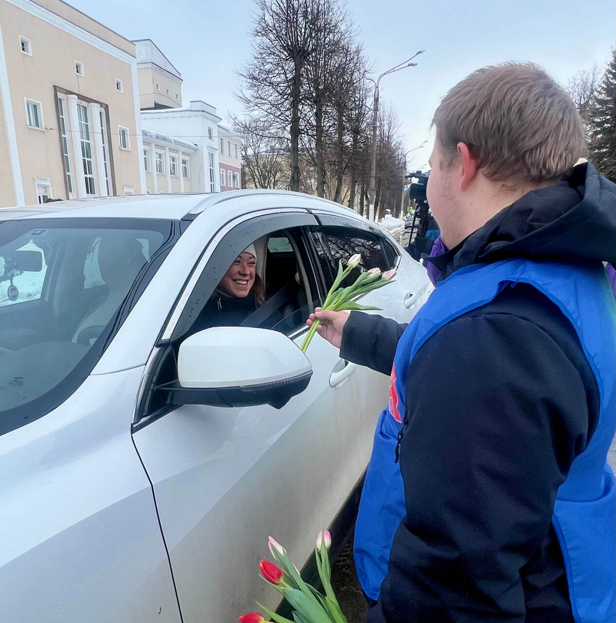 Женщин, управляющих автомобилями цветочный десант поздравлял с наступающим Международным женским днем, а также желал весеннего настроения, здоровья, оставаться такими же очаровательными, позитивными и не забывать соблюдать правила дорожного движения.