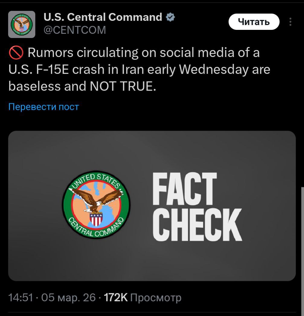 «Слухи, распространяющиеся в социальных сетях о крушении американского истребителя F-15E в Иране рано утром в среду, не имеют под собой оснований и не соответствуют действительности».