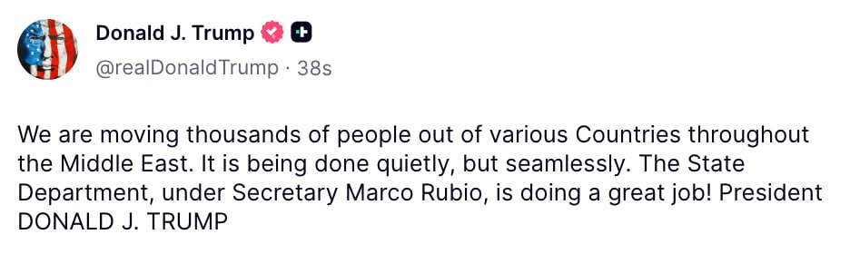 «Мы вывозим тысячи людей из различных стран Ближнего Востока. Это делается тихо, но без сбоев. Государственный департамент под руководством госсекретаря Марко Рубио отлично справляется со своей работой».