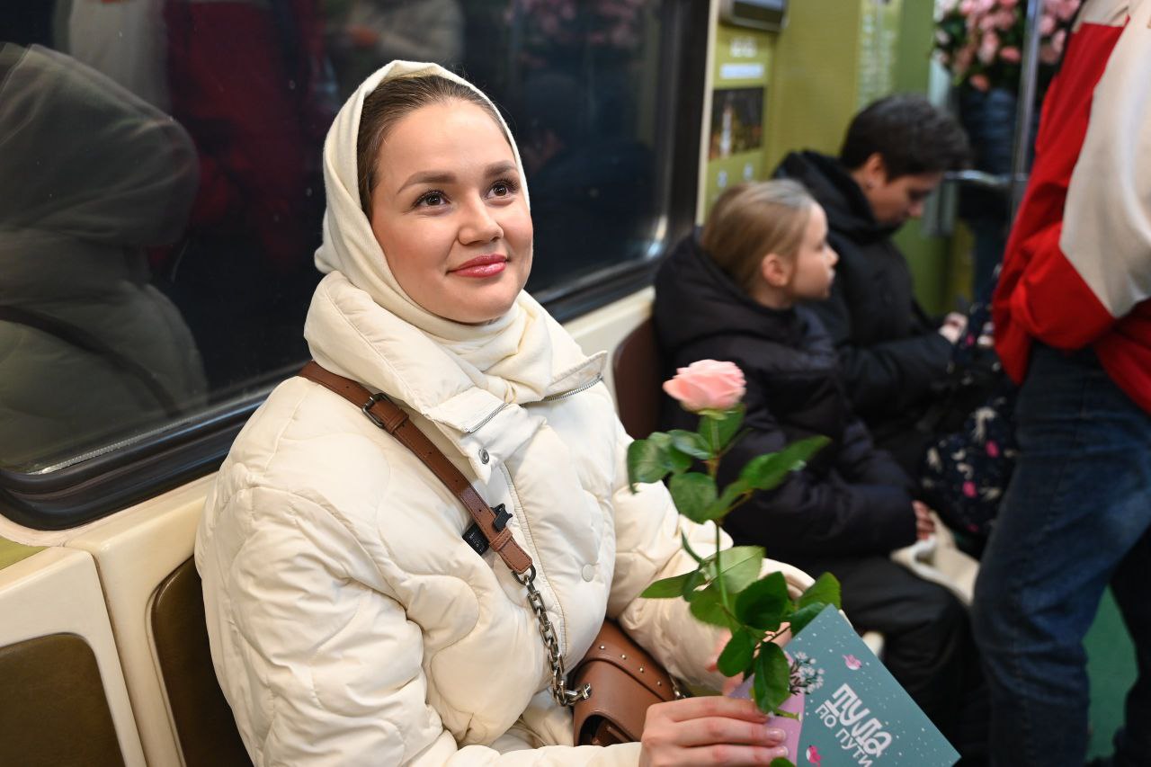 Все это розовое великолепие сегодня получили москвички - пассажиры Арбатско-Покровской линии метро, им дарили розы из тульских теплиц и весенние открытки.