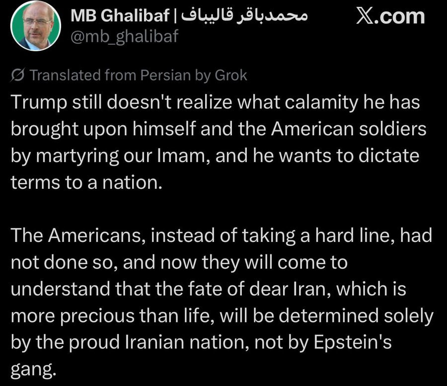 Судьба Ирана «будет определяться исключительно гордым иранским народом, а не бандой Эпштейна», заявил спикер иранского парламента Мохаммад-Багер Галибаф.