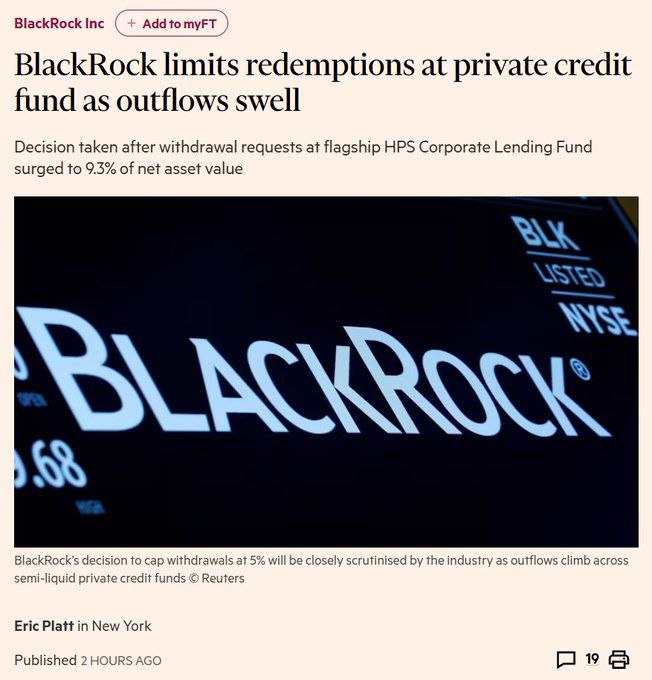 Два крупнейших фонда в мире ограничивают сумму, которую вы можете забрать. BlackRock заморозил запросы на вывод средств в размере $1,2 млрд из своего частного кредитного фонда. Инвесторы фонда BlackRock с активами в $26 млрд запросили вывод 9,3% своих средств. BlackRock отказал, ограничив вывод средств 5%.