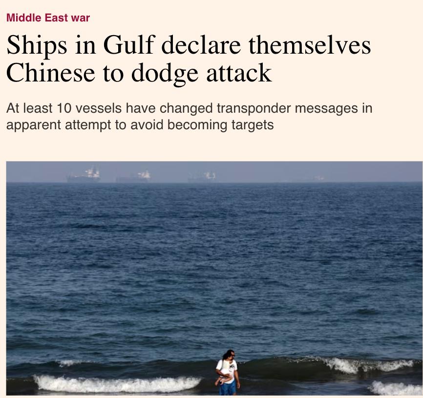 FT пишет, что предприимчивые капитаны танкеров, застрявших в Персидском заливе из-за закрытия Ормузского пролива, специально меняют данные своих транспондеров, мимикрируя под китайские суда, чтобы избежать атак со стороны Ирана.