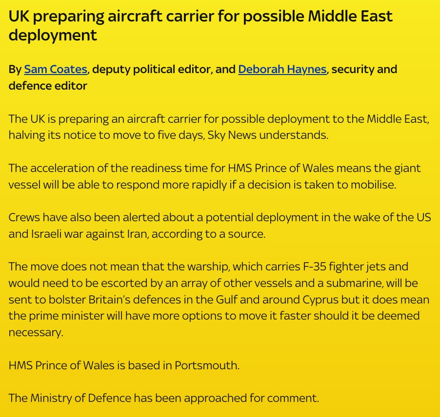 «Великобритания готовит авианосец к возможному развёртыванию на Ближнем Востоке, сократив время его готовности к выходу в море до пяти дней, сообщает Sky News.