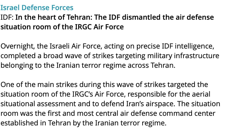 ЦАХАЛ заявил, что ударил по центру управления ВВС КСИР в Тегеране, отвечающему за оценку воздушной обстановки и защиту воздушного пространства Ирана.
