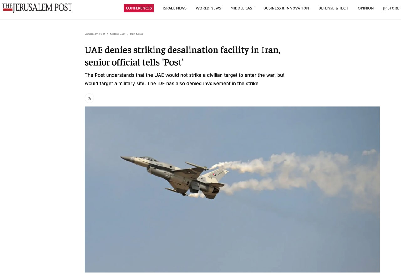 В ОАЭ опровергли сообщения о том, что Эмираты нанесли удар по опреснительной установке в Иране.