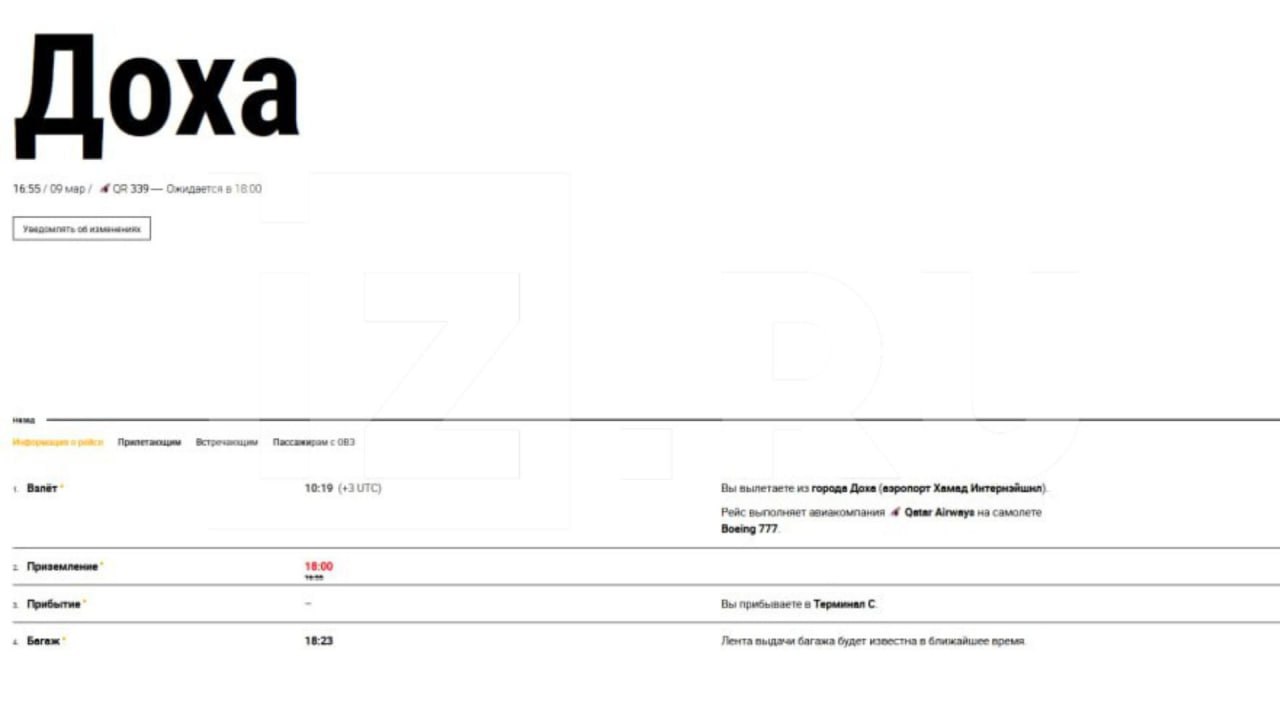 Первый за почти девять суток самолет из Дохи прибудет в Москву в 18:00 мск, следует из данных на сайте аэропорта Шереметьево