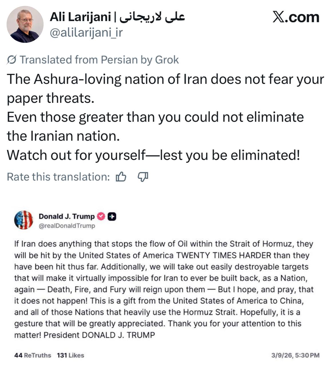 Иранская нация не боится ваших пустых угроз. Даже те, кто сильнее вас, не смогли бы уничтожить иранскую нацию. Берегите себя — иначе вас уничтожат!
