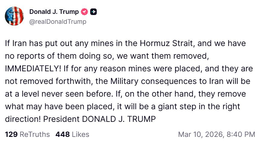 «Если по какой-либо причине мины были размещены, и они не будут убраны незамедлительно, военные последствия для Ирана будут на беспрецедентном уровне. С другой стороны, если они уберут то, что, возможно, было размещено, это будет гигантским шагом в правильном направлении!»