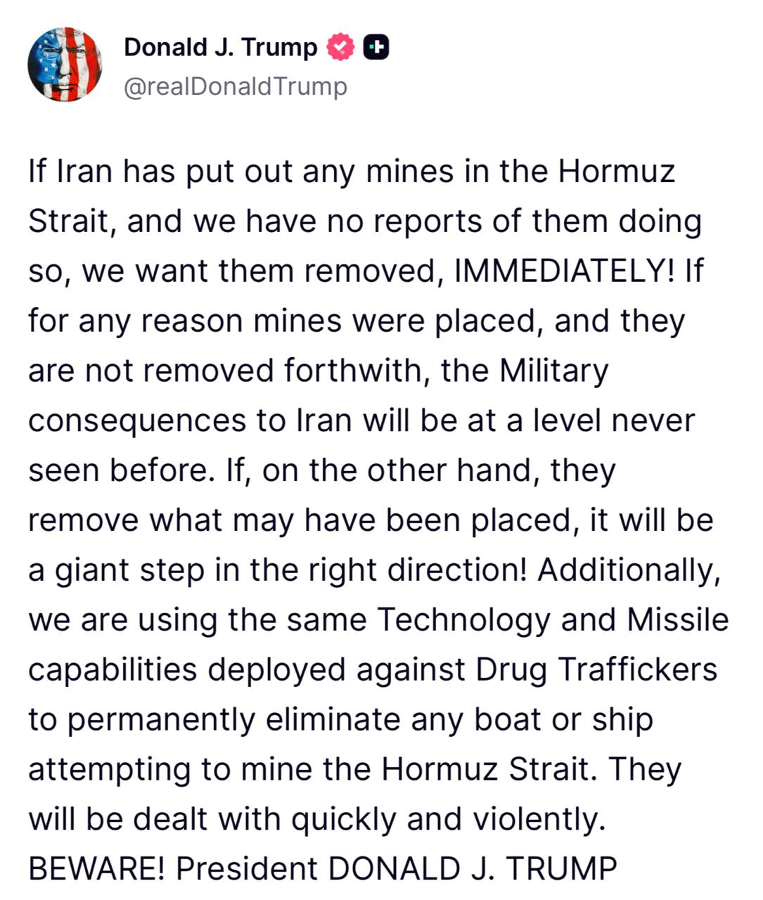 Если Иран установил какие-либо мины в Ормузском проливе, и у нас нет никаких сообщений о том, что они это сделали, мы хотим, чтобы они были немедленно убраны! Если по какой-либо причине мины были установлены, и они не будут немедленно убраны, военные последствия для Ирана будут беспрецедентными.