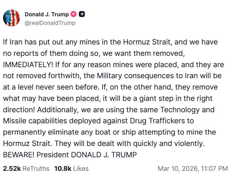 «Кроме того, мы используем ту же технологию и ракетные возможности, которые были применены против наркоторговцев, чтобы навсегда уничтожить любой катер или корабль, пытающийся заминировать Ормузский пролив. С ними разберутся быстро и жестоко. БЕРЕГИТЕСЬ!»