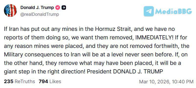 ![[Donald J. Trump] Если Иран разместил мины в Ормузском проливе, а у нас нет сообщений о том, что они это сделали, мы требуем, чтобы их убрали, НЕМЕДЛЕННО!](https://nmosknews.ru/img/20260311/3e754f6f17a4df16de0c10aec0e368e5_o.jpg)