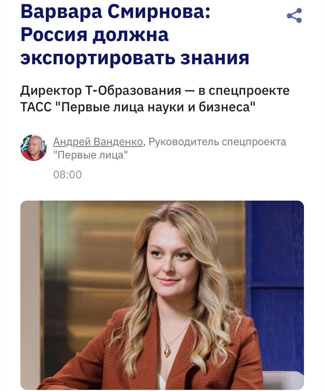 Директор Т-Образования Варвара Смирнова в большом интервью журналисту ТАСС Андрею Ванденко рассказала о том, как частный бизнес помогает развивать российскую систему образования.
