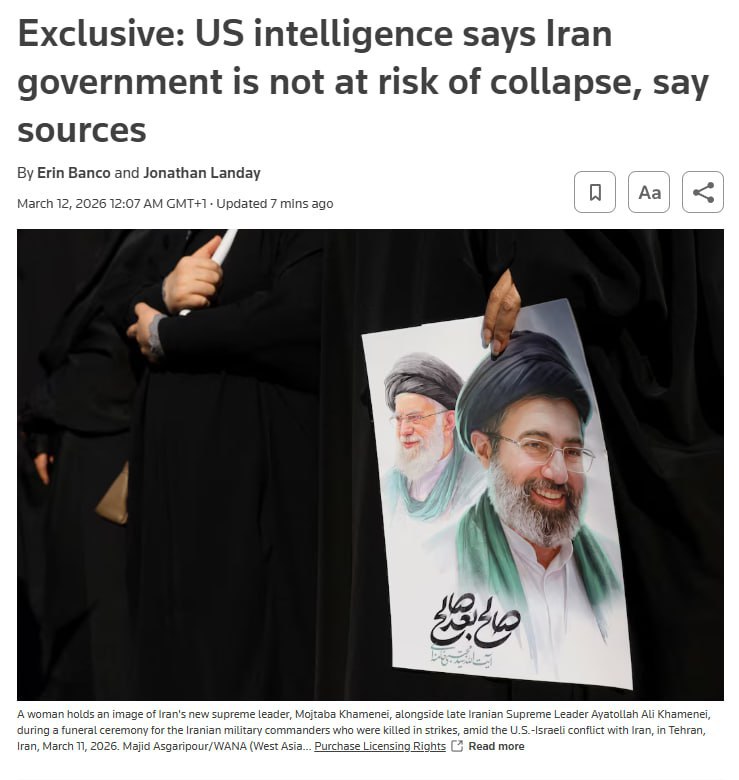 Несмотря на почти две недели ударов США и Израиля, руководство Ирана полностью контролирует ситуацию, сообщает Reuters со ссылкой на оценки американской разведки.