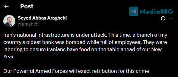 Национальная инфраструктура Ирана подвергается нападениям. На этот раз филиал старейшего банка моей страны был взорван, в то время как в нем находились сотрудники. Они работали, чтобы обеспечить иранцев едой в преддверии нашего Нового года.Наши могущественные Вооруженные силы отомстят за это преступление.