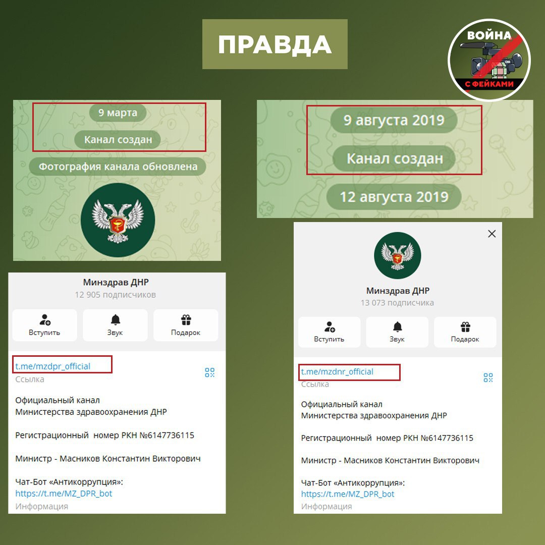 Канал, где было размещено сообщение, называется так же, как и официальная группа Минздрава ДНР. Его адрес отличается от оригинала всего на одну букву.