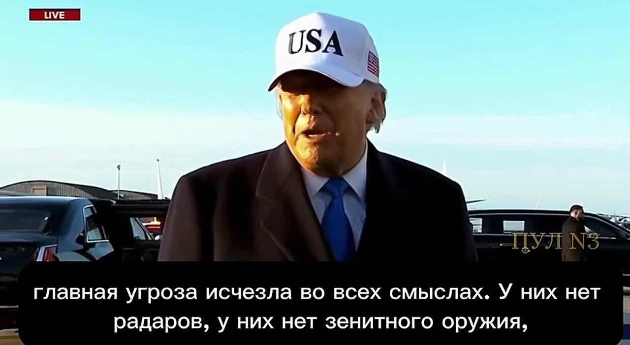 И независимо от того, могут ли они произнести эти слова или даже сражаться, их флот уничтожен, их военно-воздушные силы уничтожены, большая часть их армии уничтожена, главная угроза исчезла во всех смыслах. У них нет радаров, у них нет зенитного оружия, и, конечно же, у них нет способа обнаружить что-либо. Так что почти всё уничтожено, и вы это увидите. Но сегодня мы запустили очень сильные удары, очень мощные удары.