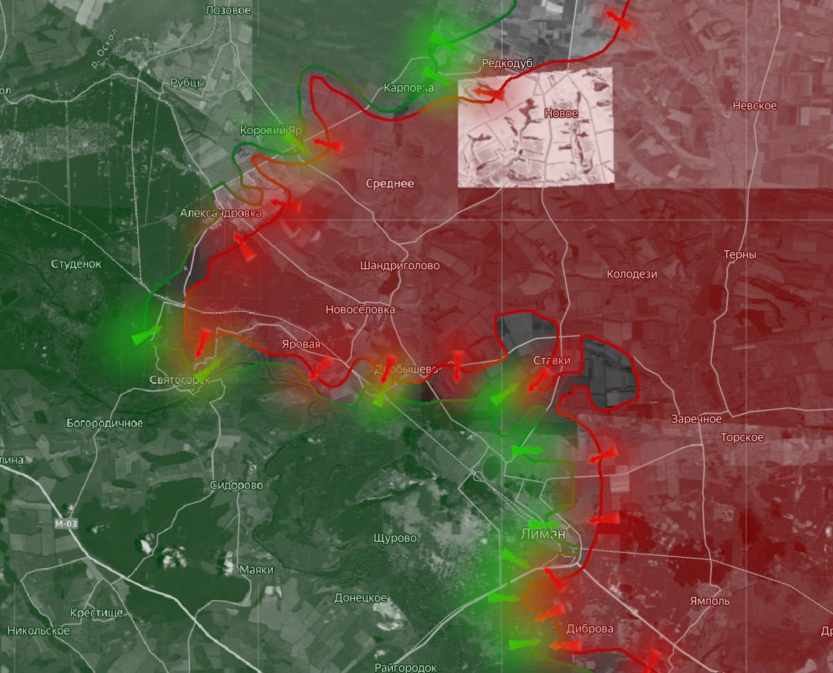 Также армия РФ захватила еще часть Дробышева и прорывается в сторону Лимана. Идут бои за один из крупных опорников – российские войска пытаются выйти к северным окраинам города. А южнее идет охват Лимана через лес, где российским подразделениям удалось перерезать одну из просек».