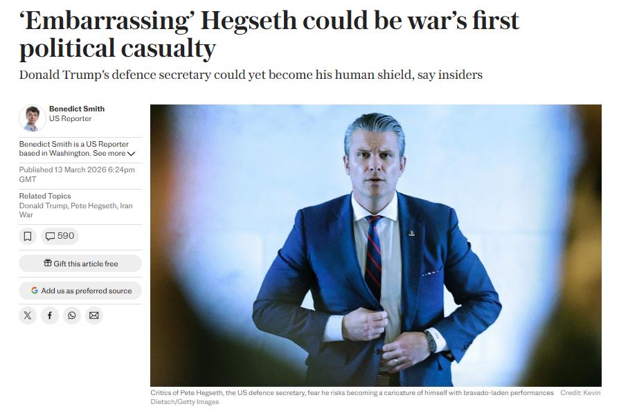 Источники The Telegraph утверждают, что Дональд Трамп может использовать министра войны Пита Хегсета в качестве политического «живого щита» на фоне войны с Ираном.