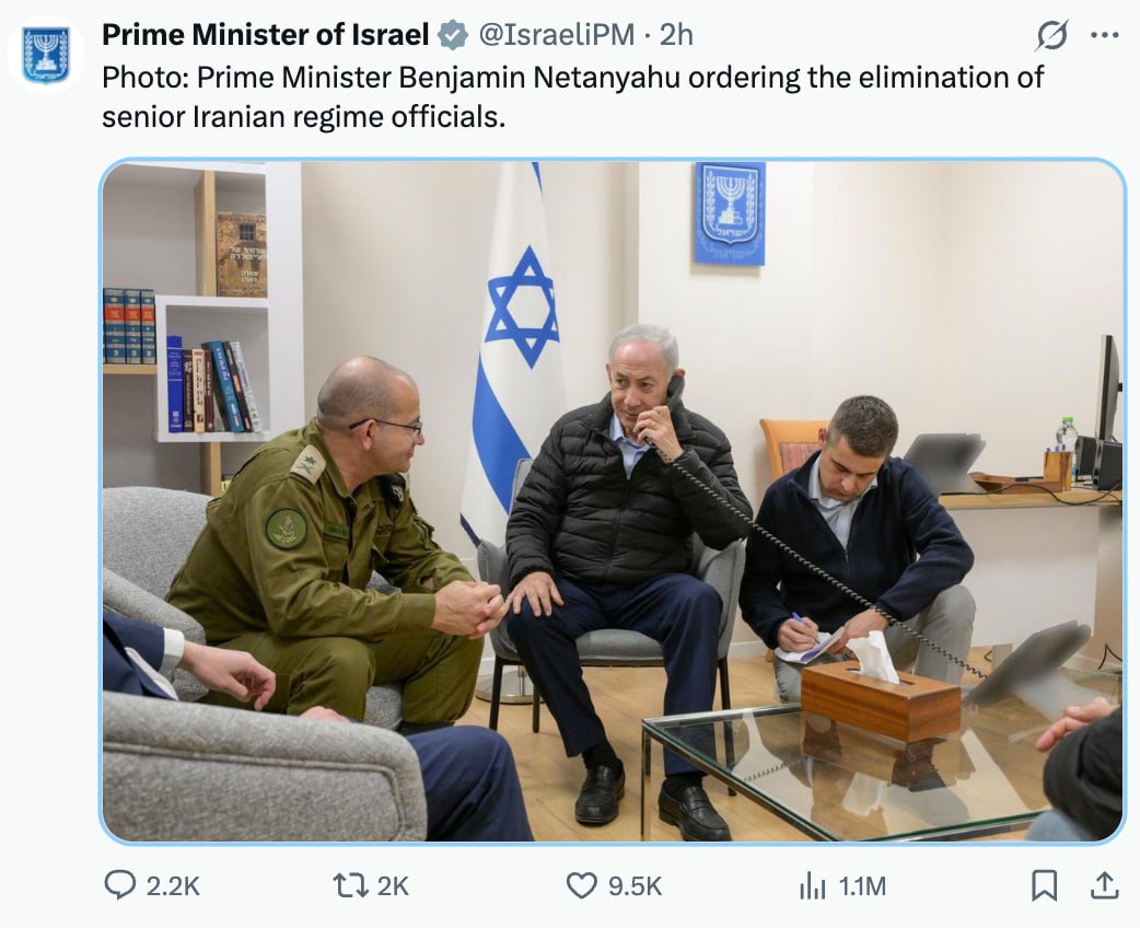 Официальный аккаунт офиса Нетаньяху опубликовал фото, на котором премьер-министр Израиля отдаёт приказ о ликвидации секретаря Совета национальной безопасности Ирана Али Лариджани.