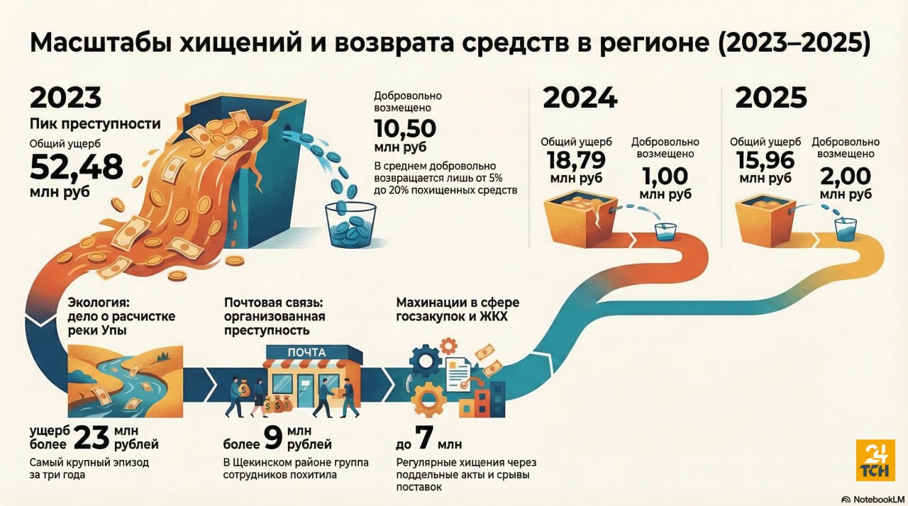 В Тульской области за последние три года по уголовным делам о бюджетных хищениях зафиксирован ущерб более чем на 87 млн рублей. Часть средств удалось вернуть добровольно. Такие данные ТСН24 привели в прокуратуре области.