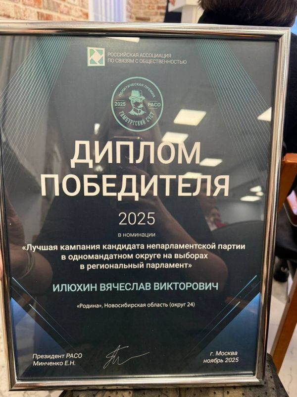 С огромной радостью и гордостью сообщаем, что в номинации «Лучшая избирательная кампания кандидата от непарламентской партии по одномандатному округу в Законодательное Собрание» победил наш лидер в Новосибирской области – председатель регионального отделения Партии «РОДИНА», депутат Законодательного Собрания Вячеслав Илюхин!