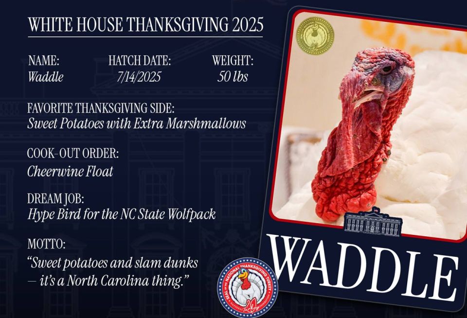 В этом году повезло Waddle ("Вихлюн») и Gobble ("Курлыка"). Для них придумали смешную биографию, согласно которой Вихлюн мечтает стать талисманом спортивной команды штата Новая Каролина, а Курлыка любит бисквиты с маслом.