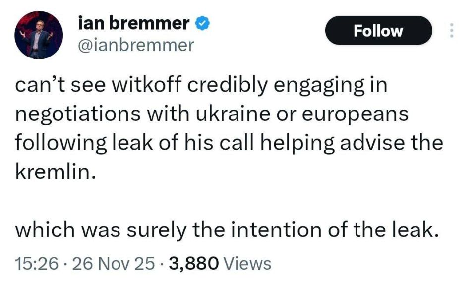 Политолог и президент Eurasia Group Иэн Бреммер считает, что целью слива в Bloomberg было вывести Уиткоффа из переговорного процесса: "Я не вижу, как после этого звонка Уиткофф может оставаться переговорщиком с украинцами и европейцами". А экс-помощник Барака Обамы, старший научный сотрудник Совета по международным отношениям США Чарльз Купчан: "Очевидно, что Уиткофф работает не в связке с Рубио. У Трампа нет единой команды во внешней политике".